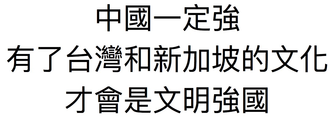 (李白 將進酒) 弘揚中華文化 有待漢文復興 大陸仍需三思: 中華精髓 泰半留存在台灣與新加坡 Where is the Chinese culture? In Taiwan and Singapore. 華人問題要由華人集思廣益來解決 崔永元演讲 談教育 大陸民主化的搖籃與春天 (開放國民出國觀光 留學 將是大陸民主化的火種 就如當年台灣政治轉型民主一般 )